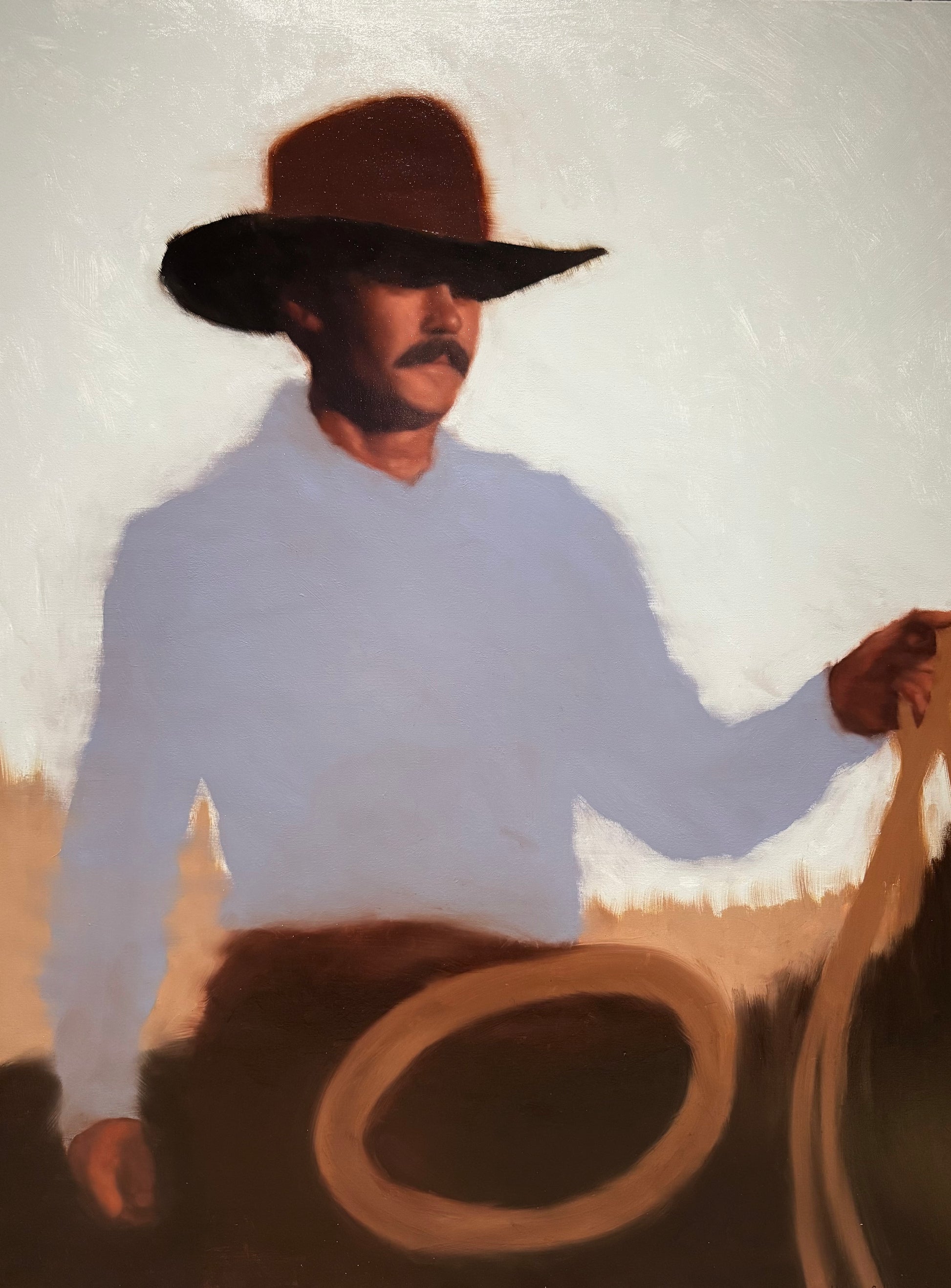 Halseth original 36"x48" oil painting. An original oil painting on linen in William Ballard's "Proof of Human" collection. The painting shows a still of model Kyle Halseth on horseback. Photo by Fallon Wentz.